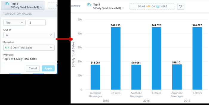 You want to see which are the top five menu categories that has sold best—select Top 5 out of All based on Daily Total Sales.