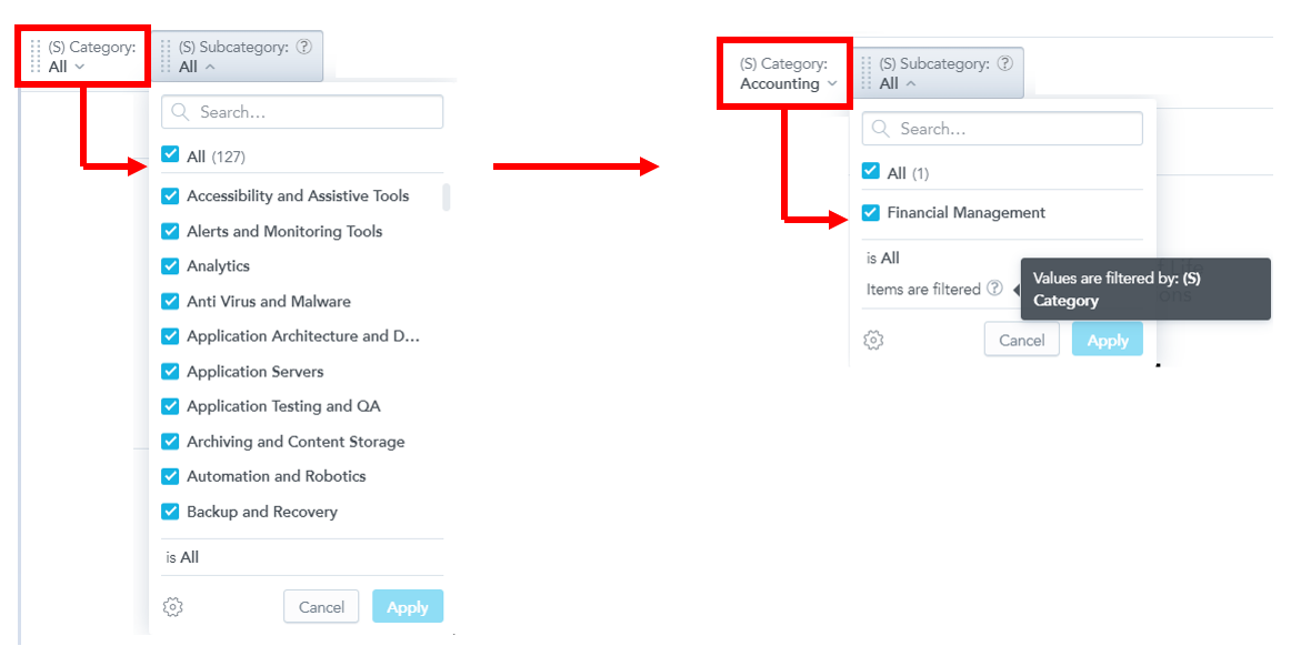You narrow the Category to display only Accounting. The Subcategory then displays only a limited set of items that correspond with Accounting.
